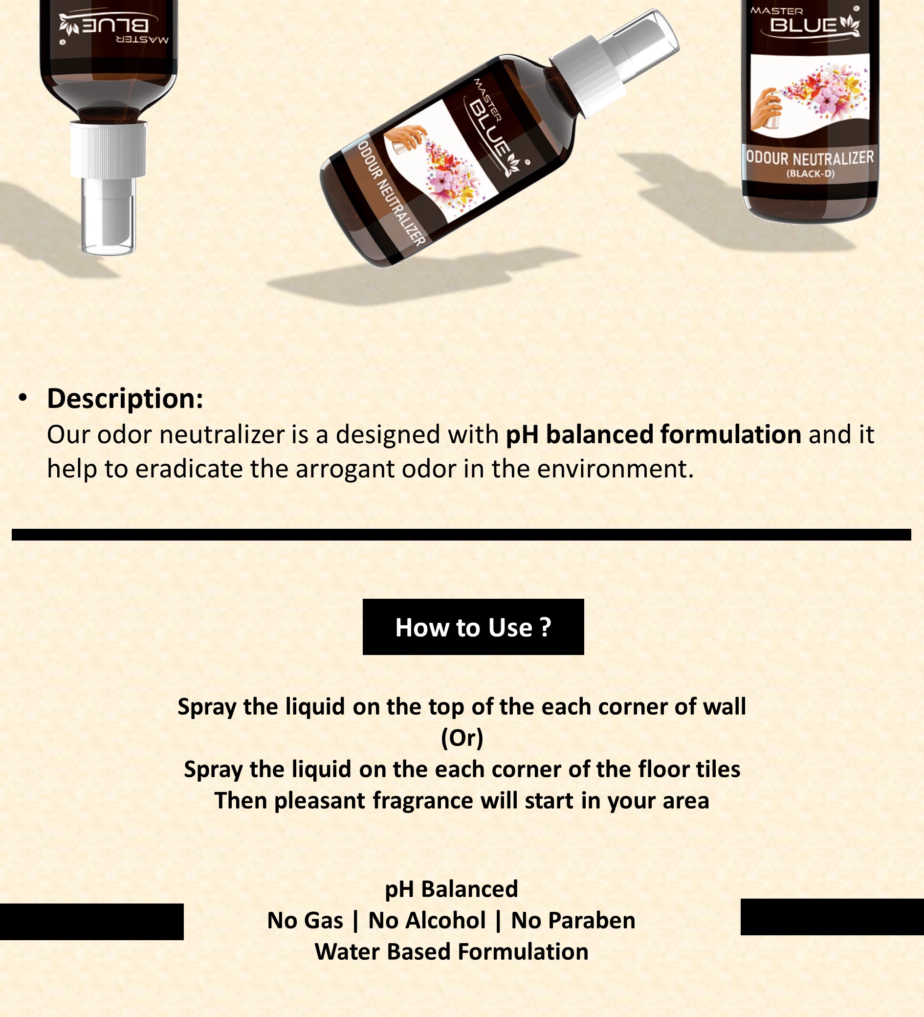 Master Blue® Our Odour neutralizer is a designed with pH balanced formulation and it help to eradicate the arrogant odor in the environment.