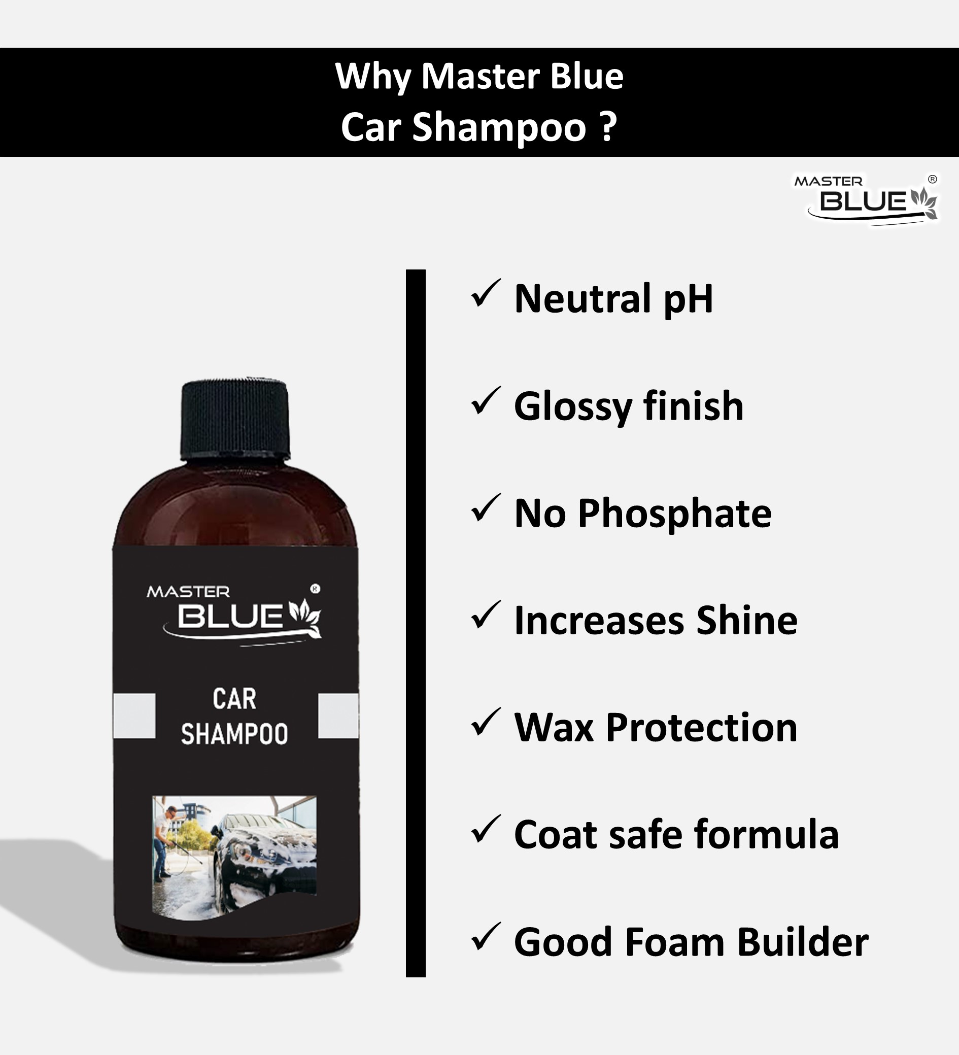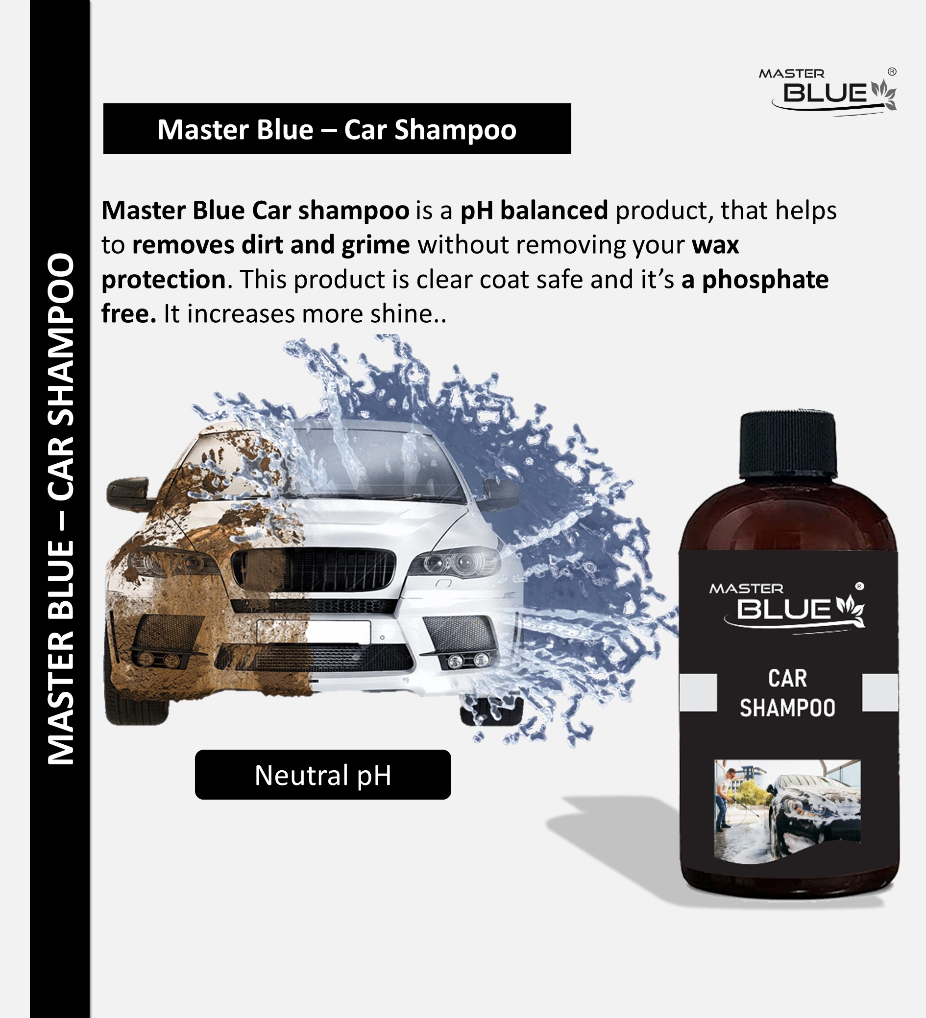 Master Blue® – Car shampoo is a pH balanced product, that helps to removes dirt and grime without removing your wax protection. This product is clear coat safe and it’s a phosphate free. It increases more shine.