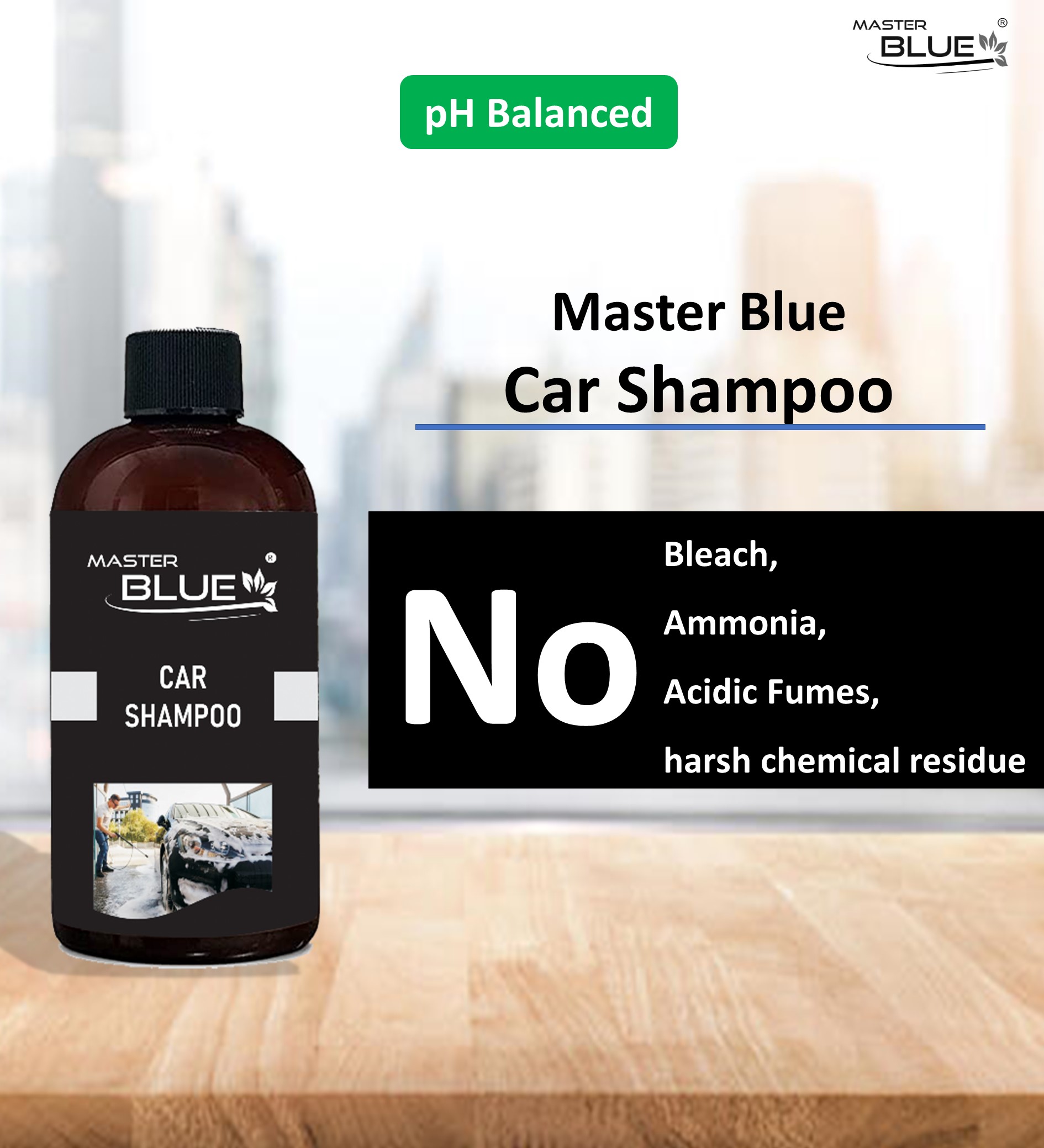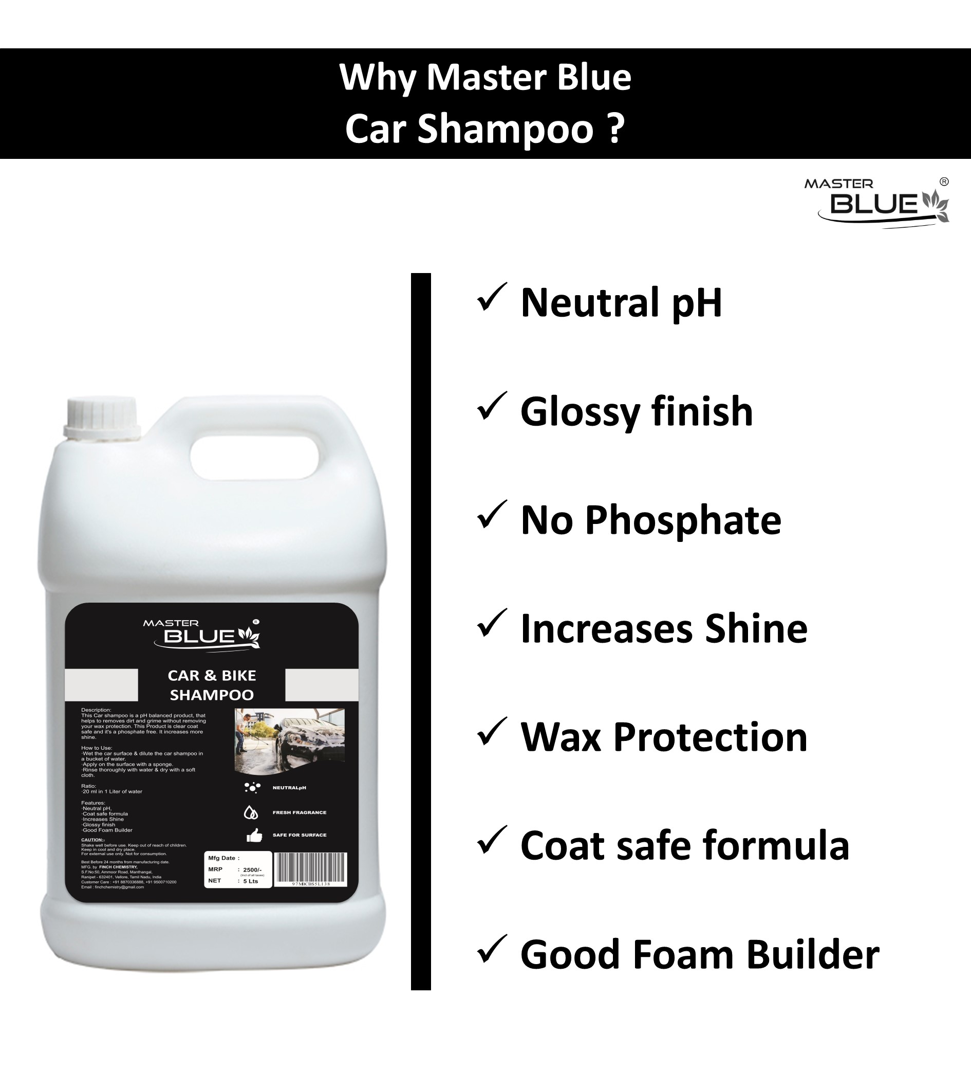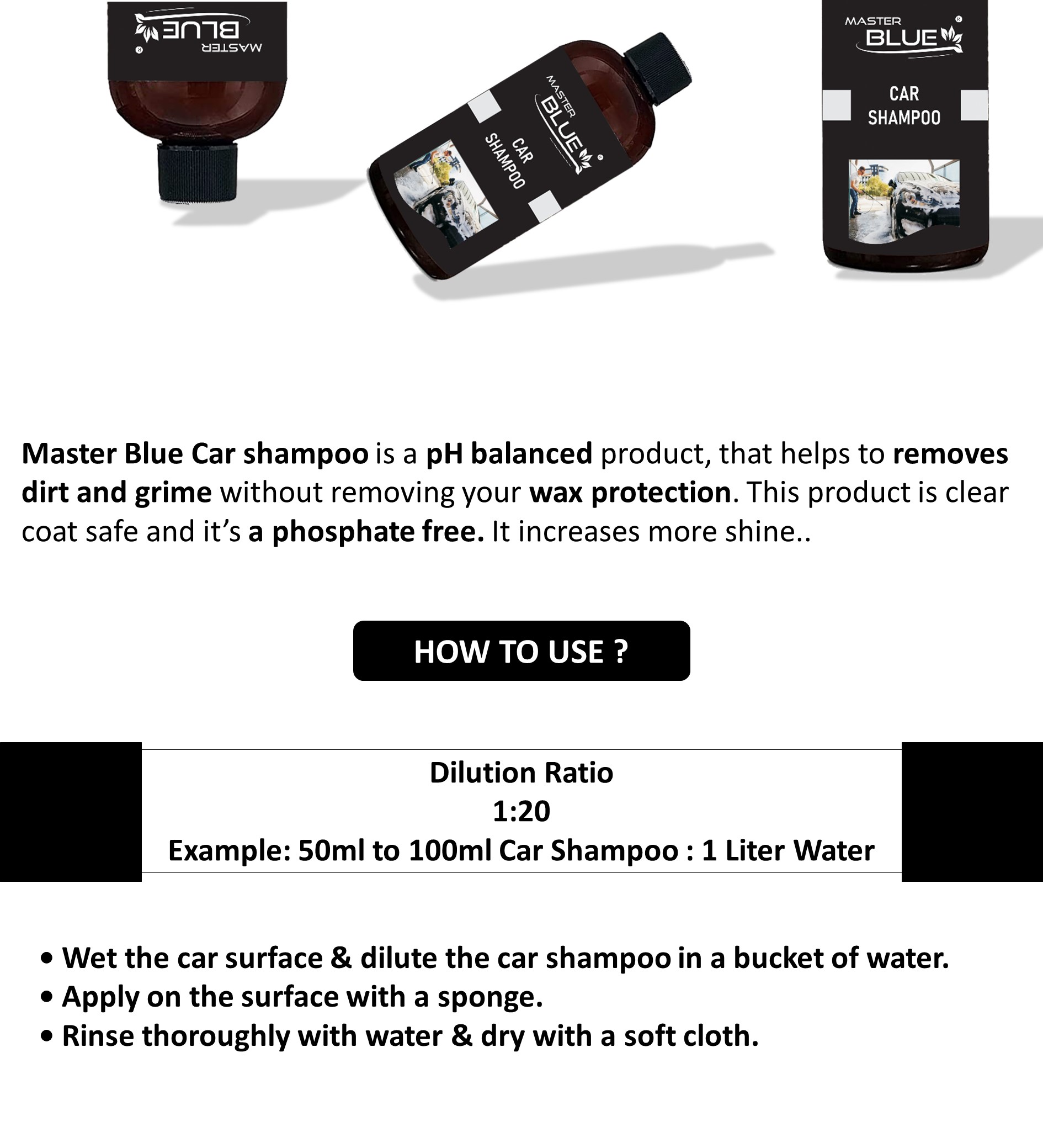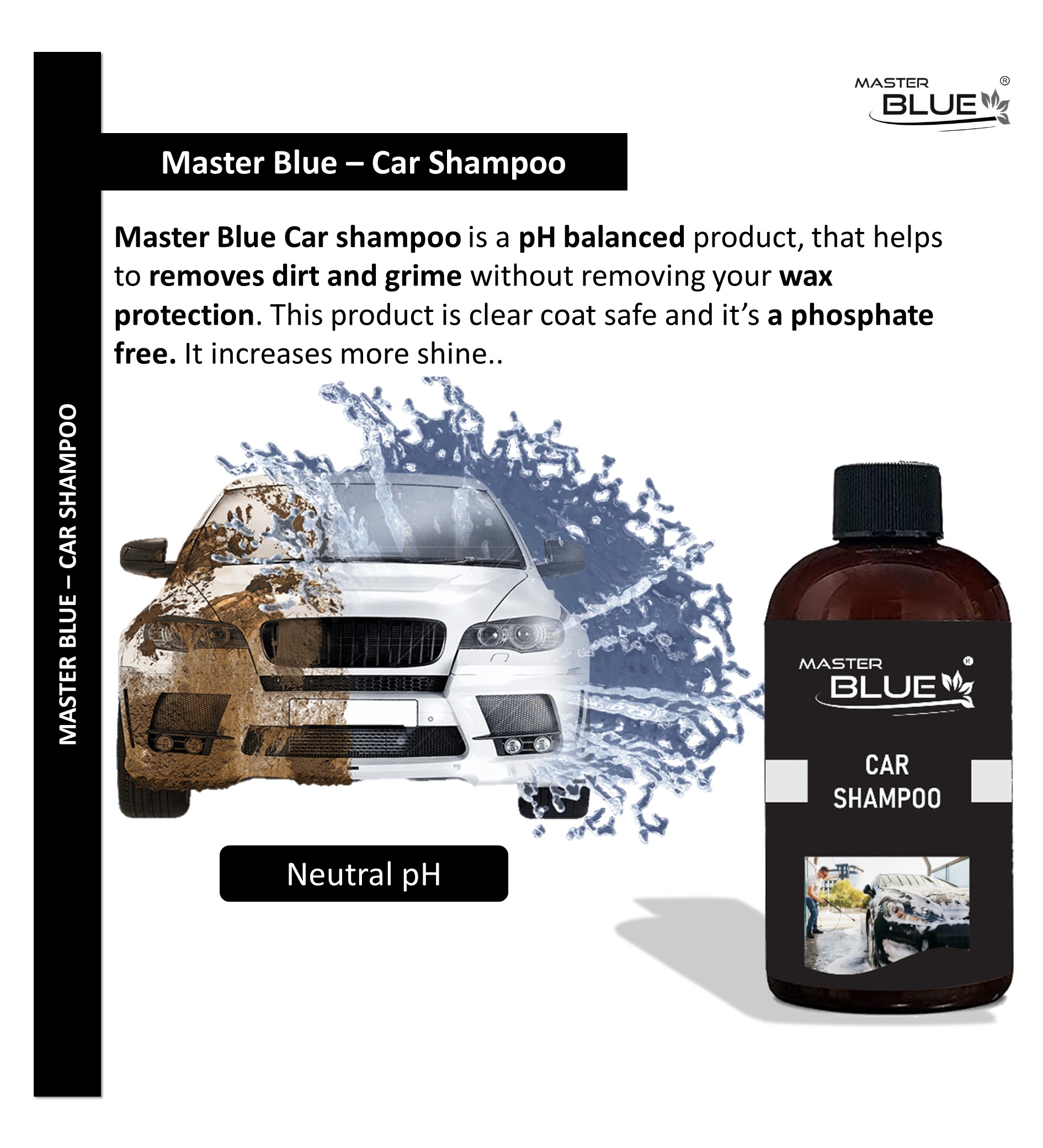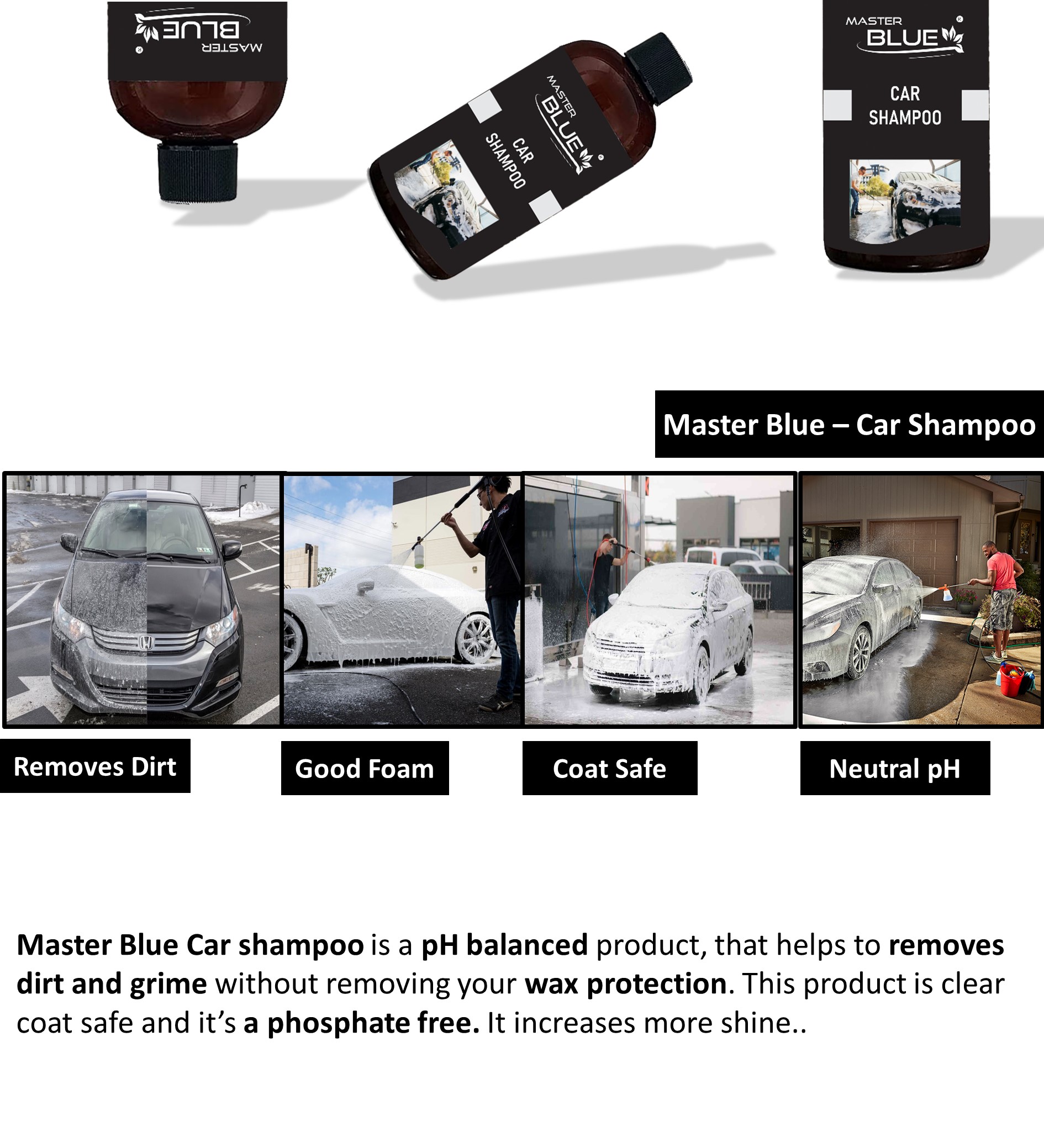 Master Blue® Car shampoo is a pH balanced product, that helps to removes dirt and grime without removing your wax protection. This product is clear coat safe and it’s a phosphate free. It increases more shine.