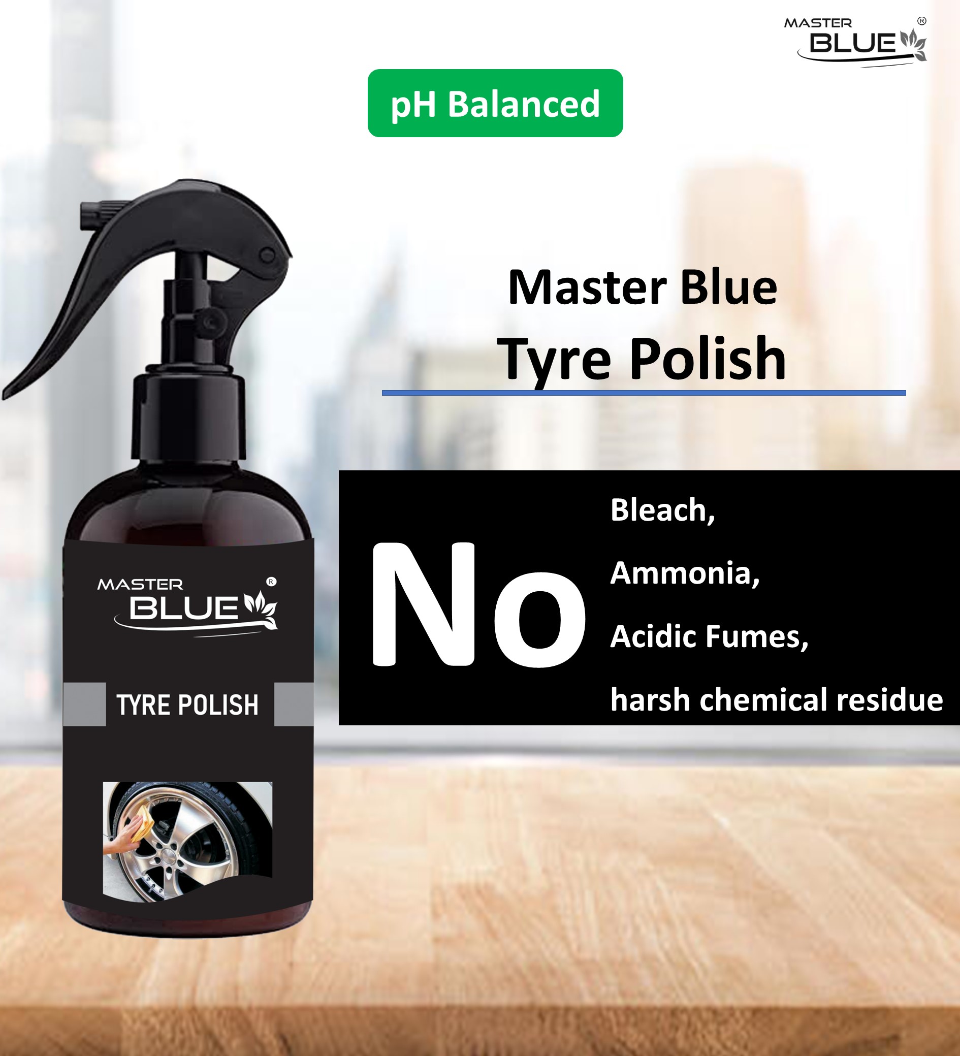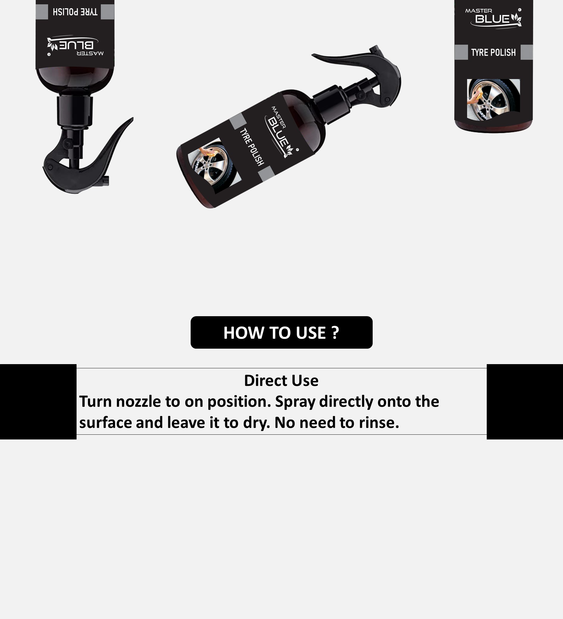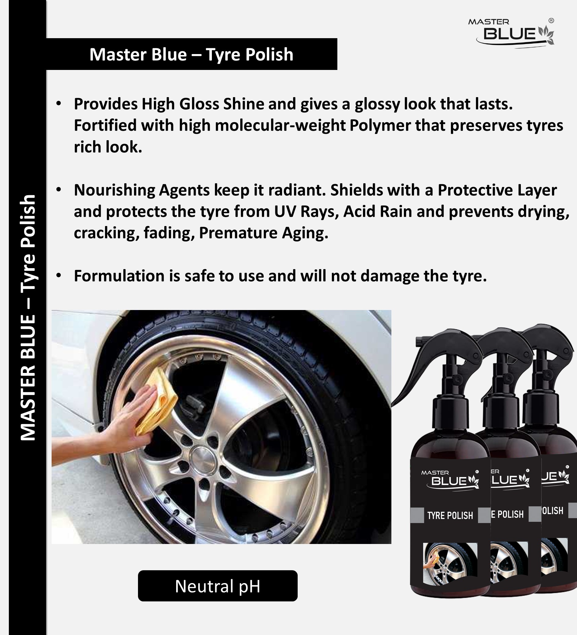 Master Blue® Tyre Polish Provides High Gloss Shine and gives a glossy look that lasts. Fortified with high molecular-weight Polymer that preserves tyres rich look.